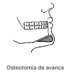 - El adelantamiento de una porción de hueso de la mandíbula, mediante cortes en el hueso (osteotomías) horizontales, utilizando también la vía intraoral. En estos casos el borde del hueso es desplazado hacia delante e inmovilizado permitiendo corregir el defecto y si es necesario es posible además acortar convenientemente una cara que sea demasiado larga.