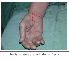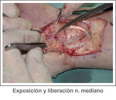 La solución a este problema es quirúrgica y se realiza con anestesia regional del brazo afectado, en cirugía ambulatoria y con estancia en Hospital de Día. Se debe realizar la liberación del ligamento anterior del carpo, con la extirpación de una banda y la liberación del nervio mediano.
